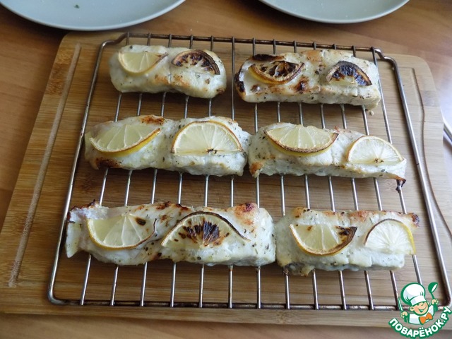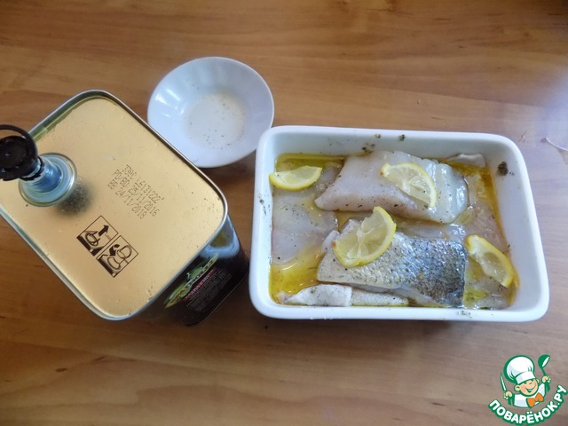 Судак, замаринованный в оливковом масле, лимонном соке, мёде с приправой для рыбы и запечённый в духовке на решётке под грилем.