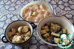 В две отдельные чаши выложить грибы и баклажаны, добавить по 3 столовых ложки маринада, перемешать.