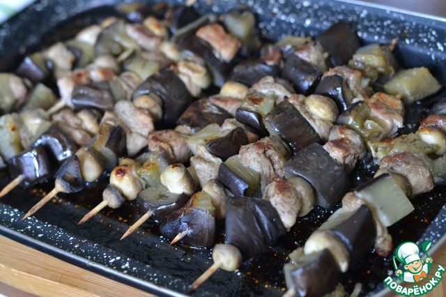 Поочерёдно нанизать на деревянные шпажки куриную грудку, шампиньоны и баклажаны. Нанизывать надо, как можно плотнее друг к другу, чтобы шашлычки были сочные. У меня получилось 8 шпажек, длина которых 25 см.