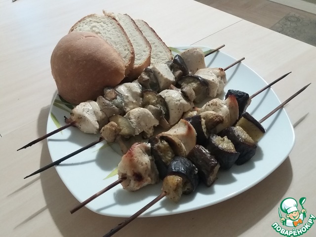 Не всегда выпадает возможность выбраться на природу и побаловать себя ароматным шашлычком, а так хочется... Предлагаю свой фирменный рецепт шашлыка из куриной грудки с шампиньонами и баклажаном. Советую обратить особое внимание на пикантный маринад, в котором маринуется мясо - это просто бомба! Шашлыки получаются сочные, нежные и невероятно вкусные!