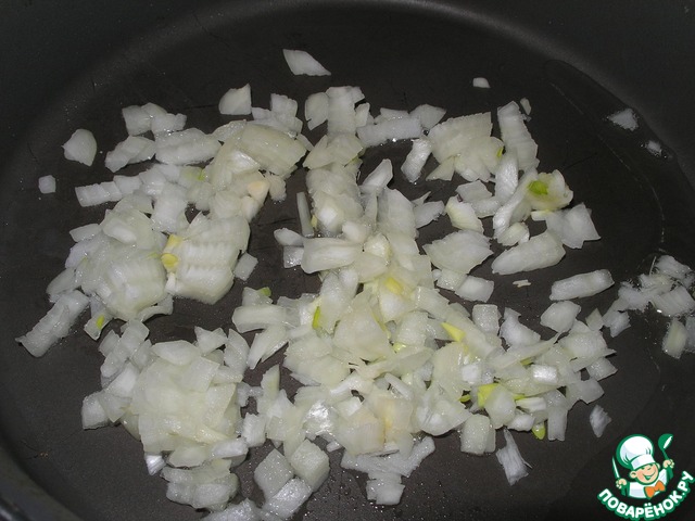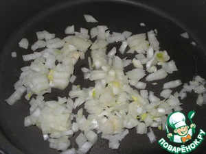 А пока займусь начинкой. Лук мелко нарезать и обжарить в растительном масле до золотистого цвета. Добавить измельчённый зубчик чеснок, обжарить ещё 1 минуту. -
