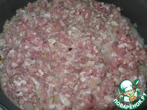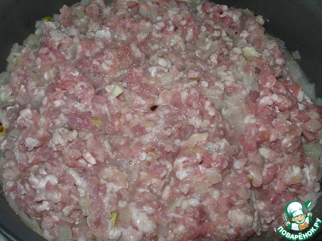 Добавить к луку и чесноку 0,5 стакана воды, а теперь кладу фарш. На небольшом огне тушить фарш около 15 минут до испарения жидкости, периодически помешивая. В конце добавить соль, чёрный перец по вкусу, а также измельчённый укроп.
