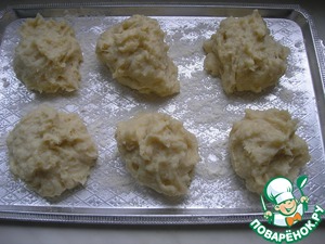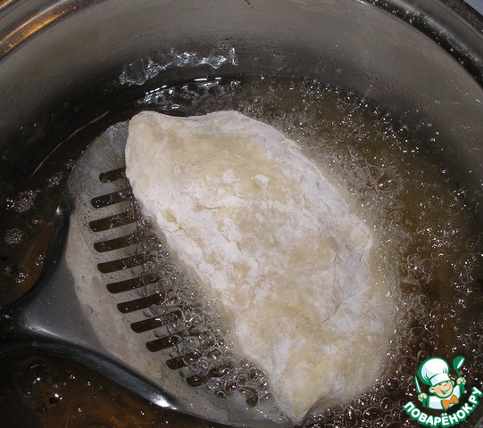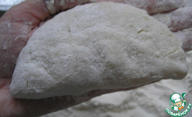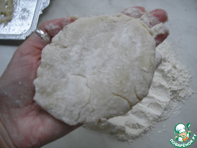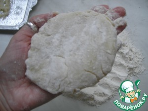 Рабочую поверхность присыпать хорошим слоем муки, взять часть теста, обвалять в муке и сформировать немного овальную форму лепёшки толщиной около 1,5 см. Тоньше не стоит делать, иначе начинка может выпасть.