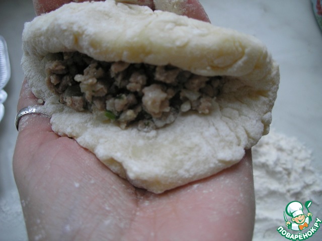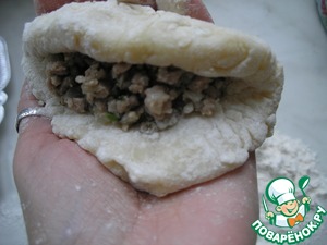 На середину кладу 1 ст. л. мясной начинки и аккуратно защипываю.