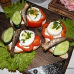 Намазать румяные ломтики хлеба намазкой. Выложить сверху ломтик огурца и ломтик болгарского перца.