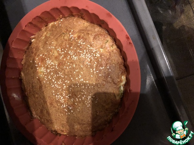 Выпекать пирог в заранее разогретой до 190°С духовке 40-45 минут до румяности. Если верх пирога начнет сильно румяниться, стоит прикрыть его фольгой.