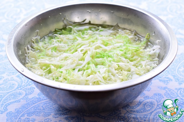 Капусту нашинковать соломкой и залить крутым кипятком на 10-15 минут, пока мы занимаемся тестом.