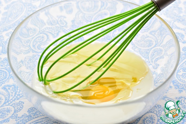 Смешать яйцо, кефир (простоквашу, негустой йогурт, ряженку, мацони...) и подсолнечное масло. Работаем венчиком или ложкой. Миксер тут совсем не нужен!