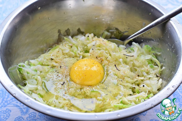 Вбить в капусту яйцо, посолить. Можно приправить вашими любимыми специями. Я использую адыгейскую соль.