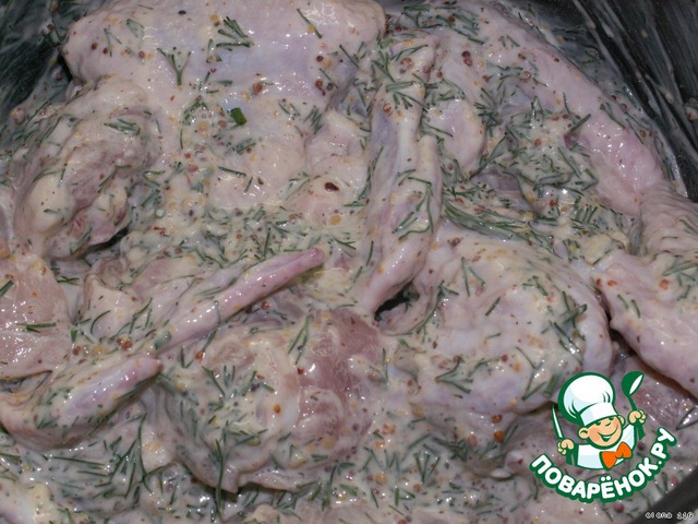Приготовить маринад из майонеза, горчицы, пропущенного через пресс чеснока, соли, перца и порезанного мелко укропа.