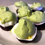 • Собираем. На свёклу выкладываем дольку яйца. Крем-паштет из авокадо я поместила в кондитерский мешок и красиво выложила поверх яйца. Всё присыпала зеленью.