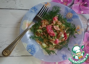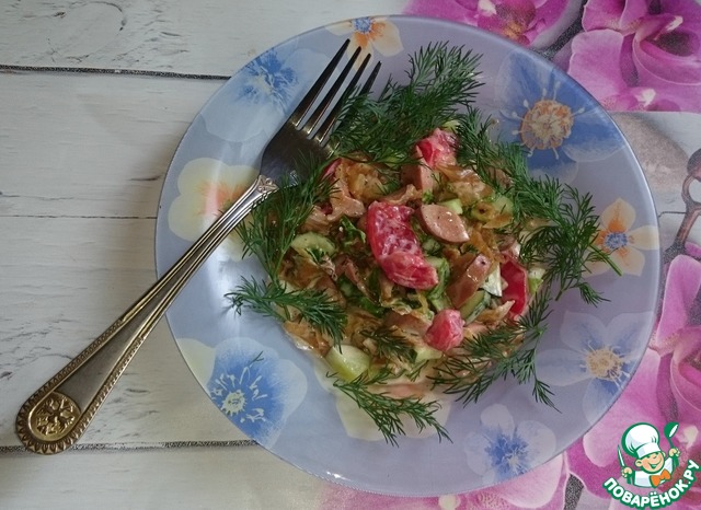 Теперь самое интересное. Берем и смешиваем капусту с сосискам и салат.
