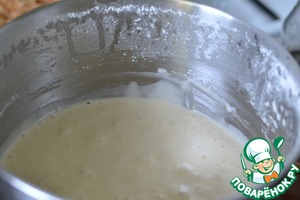 Смешать муку с разрыхлителем и, продолжая взбивать, в несколько приемов, добавить к яичной смеси. -