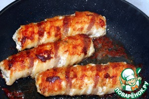 При помощи пленки колбаски завернуть в слайсы бекона.