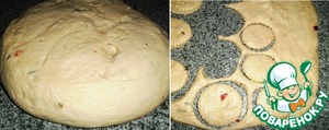 выкладываем его на смазанный маслом стол, формируем из него пласт толщиной 1,5 - 2 см, выемкой выдавливаем лепешечки.
