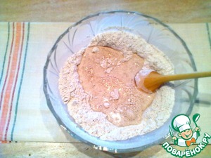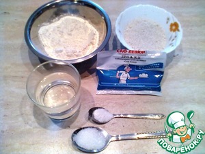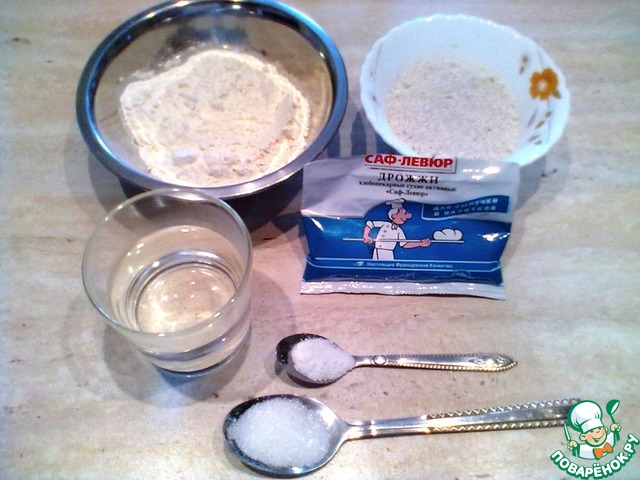 В воде растворить дрожжи и сахар, прикрыть салфеткой и оставить в тепле на 10 мин. для активации дрожжей. Два вида муки просеять дважды, смешать с солью. Влить жидкость и начинать замешивать тесто.