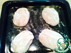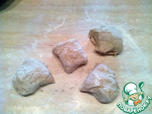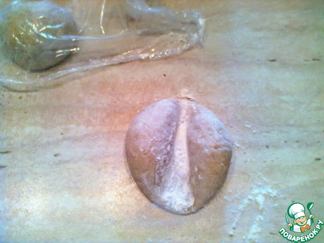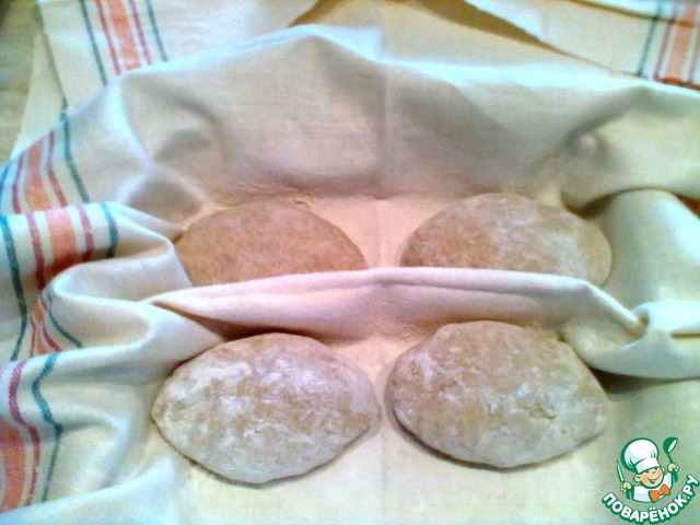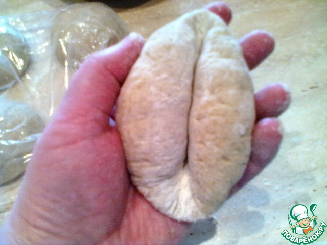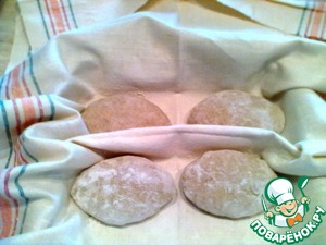 Рабочую поверхность припылить мукой, выложить тесто, чуть! обмять и обвалять в муке (работаем с пшеничной). Разделить на 4 (для полной нормы 8-10) частей и подкатать в колобки, стараться чтобы воздух из теста сильно не выходил, не надо его долго мять. Прикрыть колобки пленкой и оставить в покое на 10 мин.