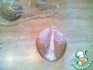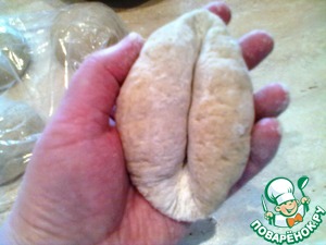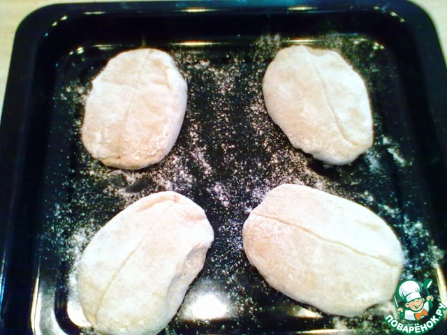 Далее формуем булочки по типу "кофейное зерно": стол должен быть припылен мукой, ребро ладони окунуть в муку и по середине придавить колобок почти до конца. Образовавшуюся бороздку обильно присыпать мукой
