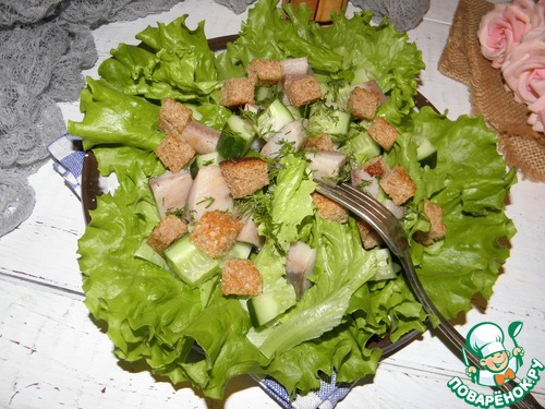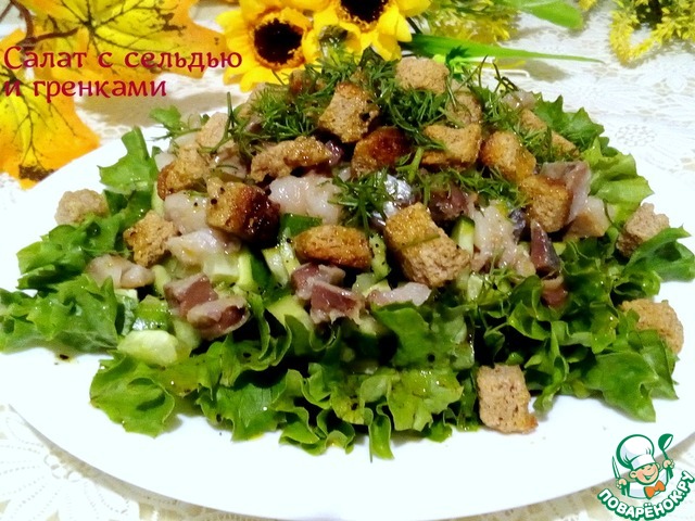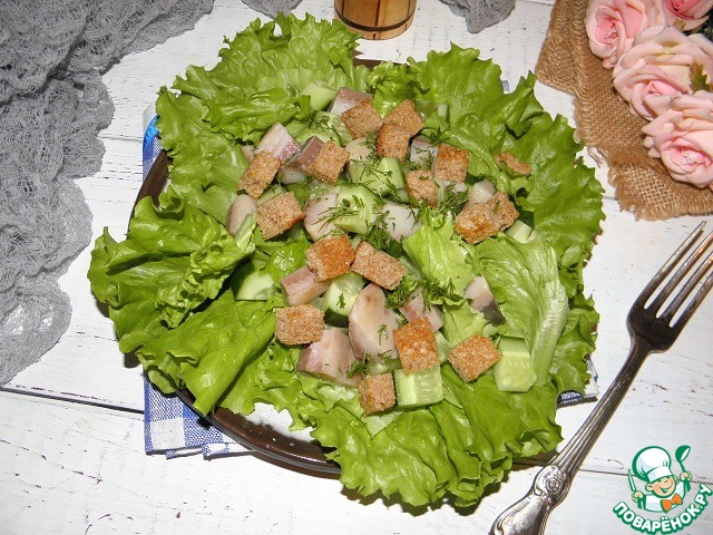 Выложить на тарелку салатные листья, кубики огурцов, кусочки сельди, полить заправкой. Посыпать гренками и рубленным укропом и подавать салат с селедкой сразу. Приятного аппетита!