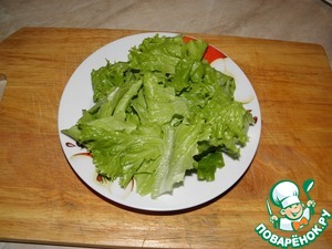 Салат вымыть, обсушить, порвать руками на небольшие куски.