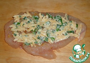 Смазываем куриное филе начинкой.