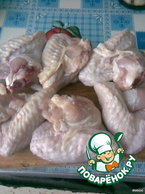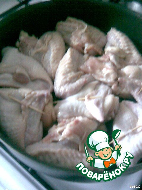 • Крылышки помыть, обсушить, скрутить в виде треугольников (можно закрепить зубочистками).