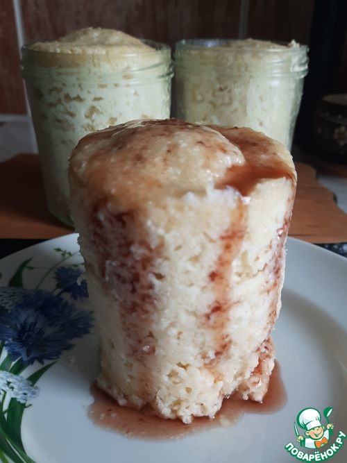 Кексы замечательно вынимаются из чашки, их можно есть, держа в руке. Можно украсить по желанию. Я полила вареньем и йогуртом и посыпала кокосом и цветными шариками. Вкусно есть и макать в сладкий соус.