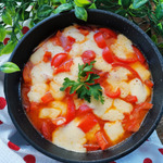 Очищенные помидоры нарезать небольшими дольками и выложить на разогретую сковороду с оливковым маслом. Как только они дадут сок, выложить соль, уксус, перец черный и острый и мед. Закрыть крышкой.