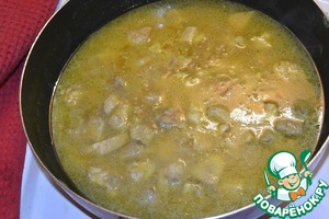 • Влить горячую воду, на палец выше мяса. Довести до кипения и тушить под закрытой крышкой минут 30.
