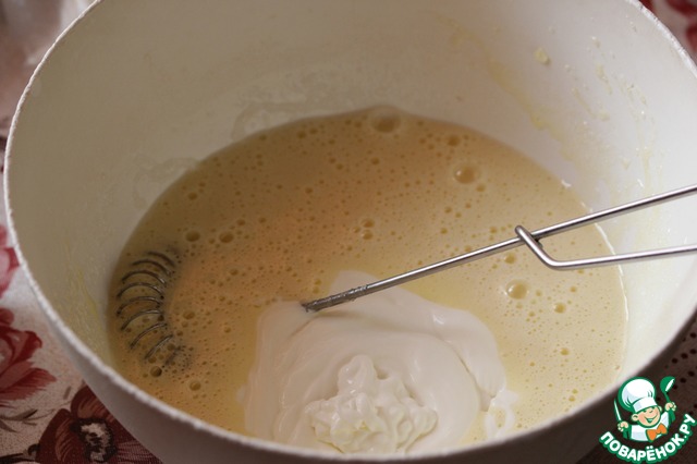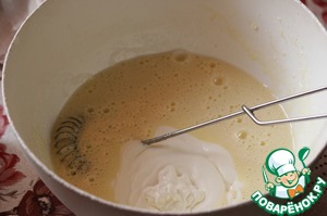 Яйца, сахар, ванильный сахар и растопленное масло взбить при помощи венчика.