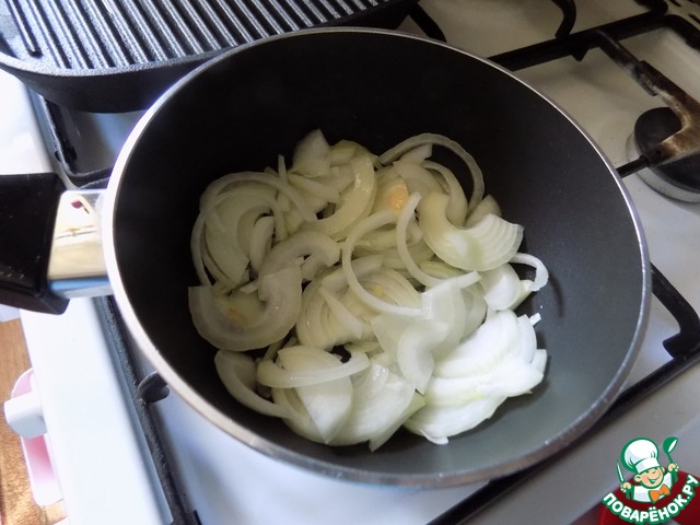 В сотейник наливаем масло, выкладываем лук порезанный и золотим его.