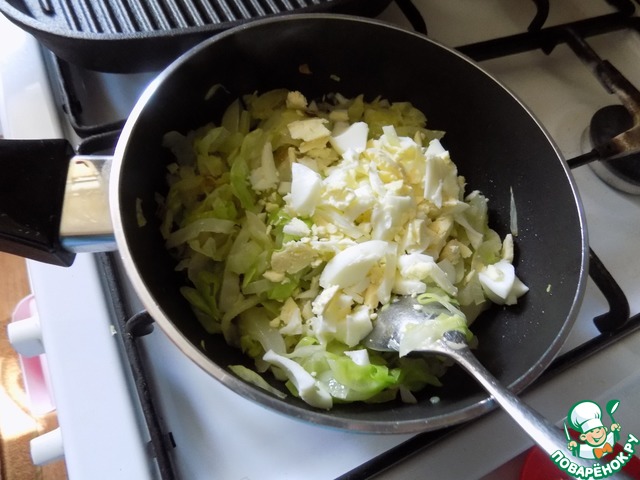Яйцо куриное чистим и рубим мелко. Добавляем к капусте в сотейник. Солим и перчим по вкусу. Перемешиваем и снимаем с огня. Начинка готова.