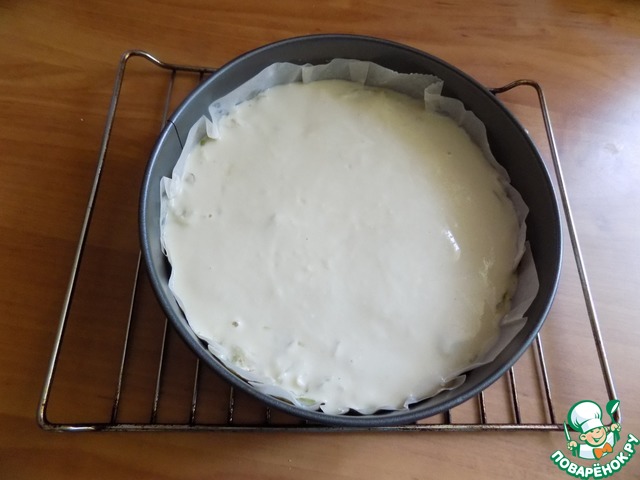 Залила оставшемся тестом. Включила духовку и нагрела её до т-200 С. Поставила форму в духовку на 40 минут. Минут через 20 накрыла верх фольгой, чтобы сильно не зажарился. Форма должна быть высокой. Пирог будет подниматься.