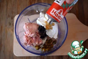 В чашу блендера выкладываем горчицу, творожный сыр, листочки тимьяна, каперсы, мясо тунца, черный молотый перец и 1-2 столовых ложки сока из-под рыбы.