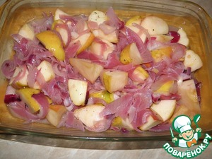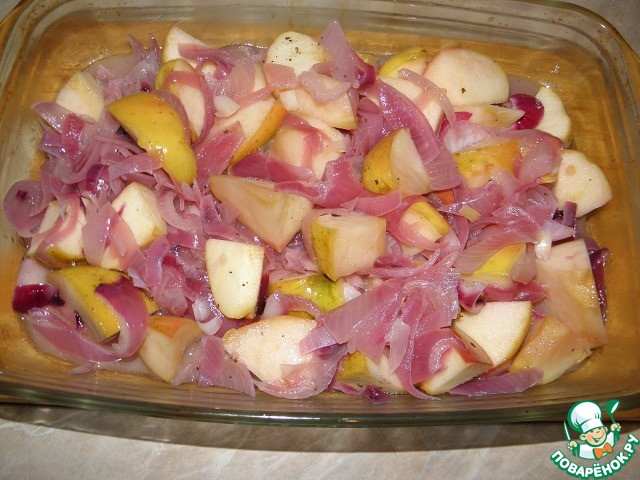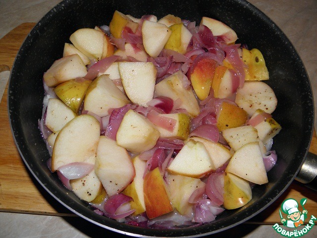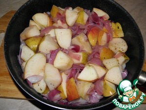 Добавить дольки яблок, посыпать одной столовой ложкой коричневого сахара, посолить, поперчить и влить яблочный сок.