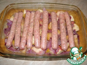 На нее колбаски, посыпать тимьяном, и еще одной ложкой коричневого сахара.