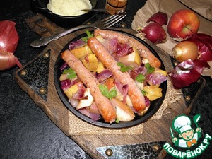 Кто любит колбаски? Рецепт предлагаю! Вот я например просто их обожаю! Но слишком желудок грузить не хочу, всегда вариант интересный ищу! А поэтому давайте их в духовке запечем! И конечно же добавим с луком яблоки еще! Сочетаются прекрасно с мясом фрукты не напрасно! Вкусно, нежно, ароматно! Так пикантно сладковато! Без фантазий нам нельзя! Угощаю вас, друзья!
