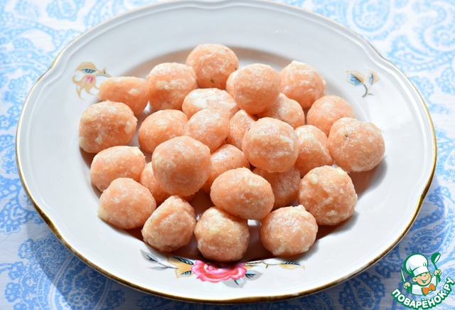 • Куриный фарш посолить, добавить к нему манную крупу, тщательно перемешать. Отставить в сторонку минут на пятнадцать, чтобы манка набухла. Сформовать небольшие фрикадельки.