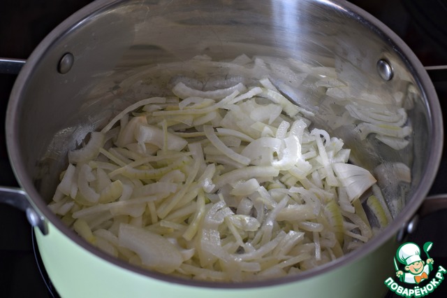 В кастрюле с толстым дном разогреть подсолнечное масло, выложить в нее репчатый лук, сразу посолить немного и обжарить 3-4 минуты до прозрачности.