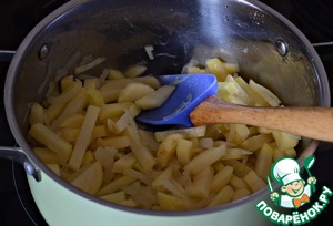 • Всыпать в кастрюлю картофель, нарезанный соломкой. Обжарить овощи пару минут.