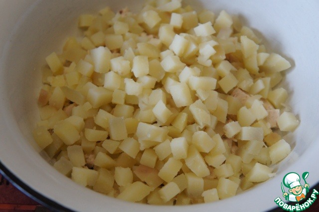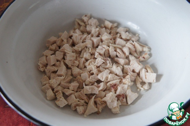 Для варианта с мясом отварить куриное филе в подсоленной воде с добавлением специй. Остудить и нарезать ломтиками. 4-5 ломтиков отложить для украшения, остальное мясо нарезать маленькими кубиками. -