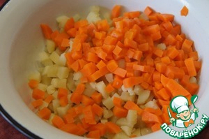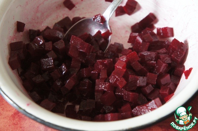 Свеклу также нарезать маленькими кубиками, положить в отдельную миску, добавить немного растительного масла и хорошо перемешать.