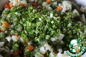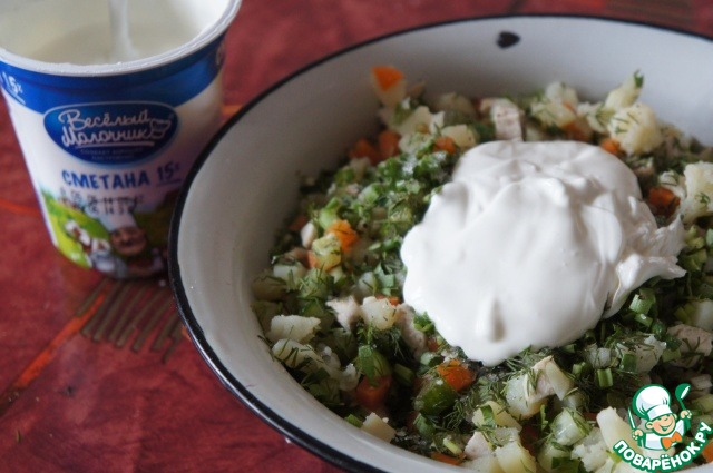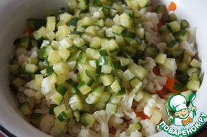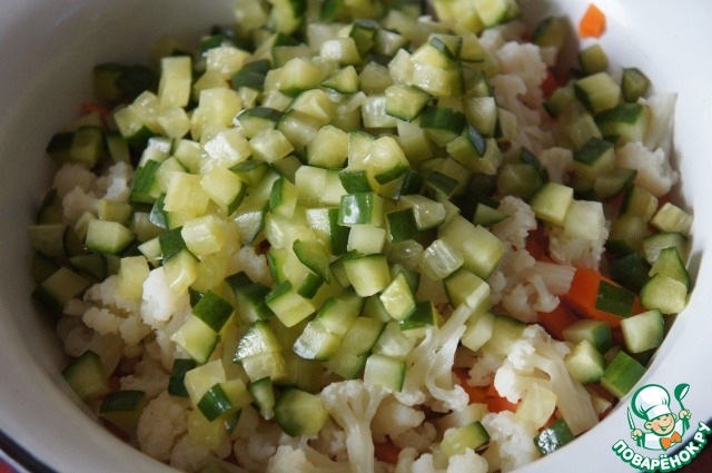 Туда же всыпать нарезанные небольшими кубиками огурцы.