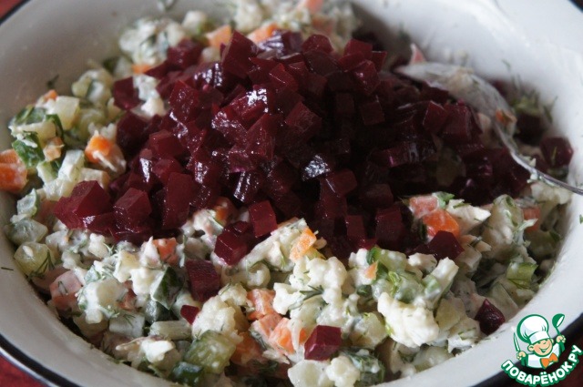 Рецептов винегрета на сайте много. По запросу поисковик выдал 212 рецептов на 22-х страницах. Стала изучать. На 16-й странице, когда пошли рецепты типа: корнуэльские пирожки, мясные шарики в бульоне, шампиньоны по-каталонски, котлеты из свежей салаки и даже конфеты для шампанского - изучение прекратила. Вот так работает наш поисковик, совершенно непредсказуемо. Я, правда, глянула еще 18, 20 и 22-ю страницы. Для очистки совести, так сказать. Ну, а теперь смело предлагаю вам свой вариант винегрета.
