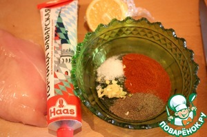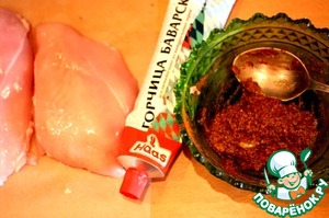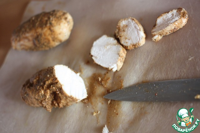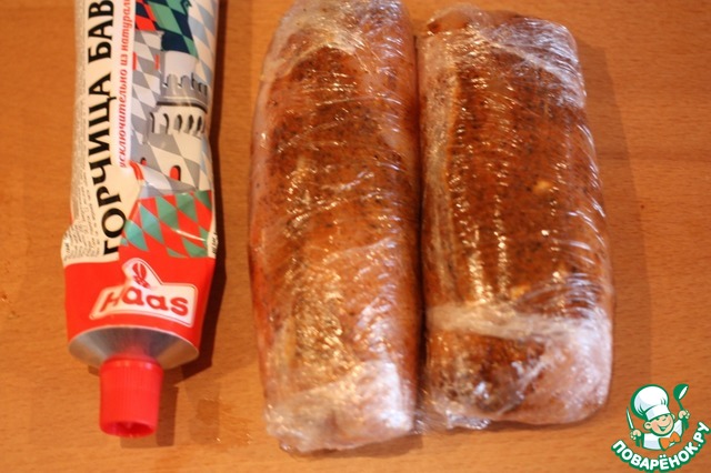 Обмазать филе и завернуть очень плотно в пищевую плёнку в несколько слоёв каждое филе так, чтобы не попадала вода, и не вытекал сок.