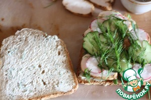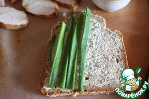 Тосты намазать сметанной намазкой, выложить зелень ( у меня зелёный лук)