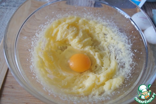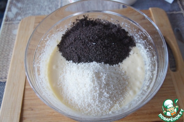 Сверху просеять муку с разрыхлителем и все еще раз тщательно перемешать или взбить.