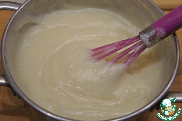Остальное молоко нагреть и вылить в смесь, интенсивно размешивая.