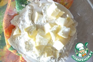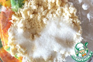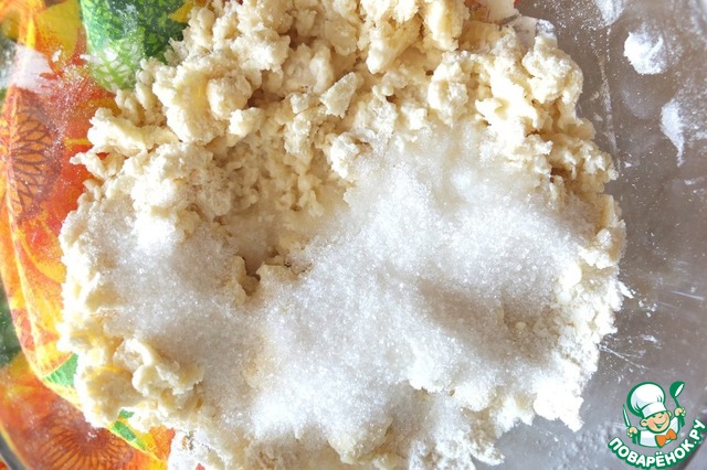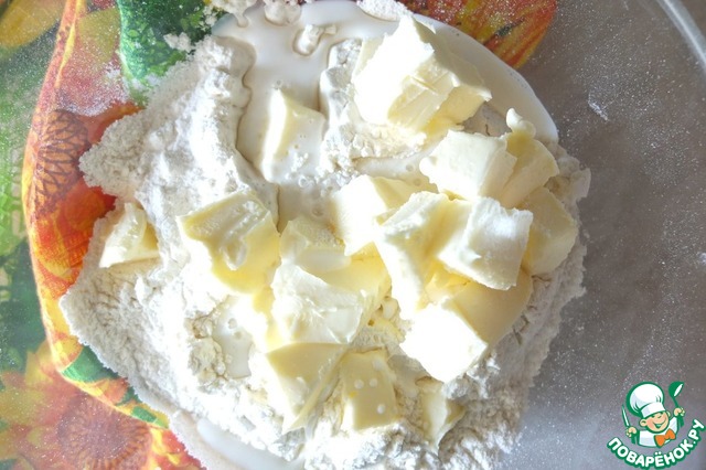 Добавляем мягкое сливочное масло и половину нормы молока. Руками перетираем тесто, превращая его в крошку.