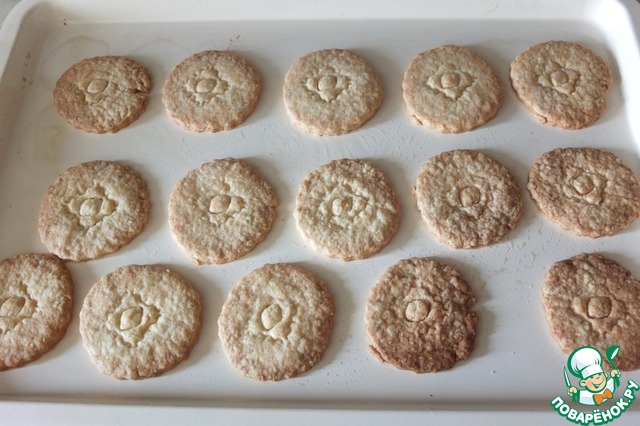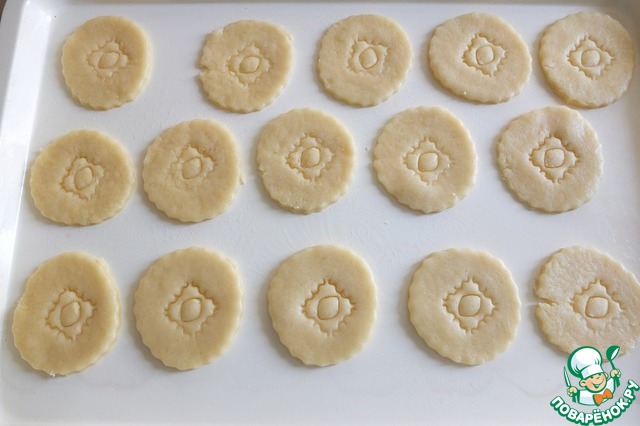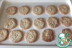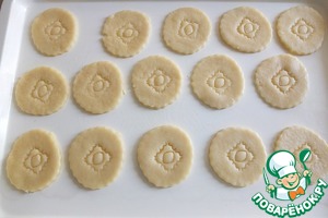 Выкладываем печенье на противень, слегка смазанный сливочным маслом. Я воспользовалась специальными выемками и нанесла рисунок.